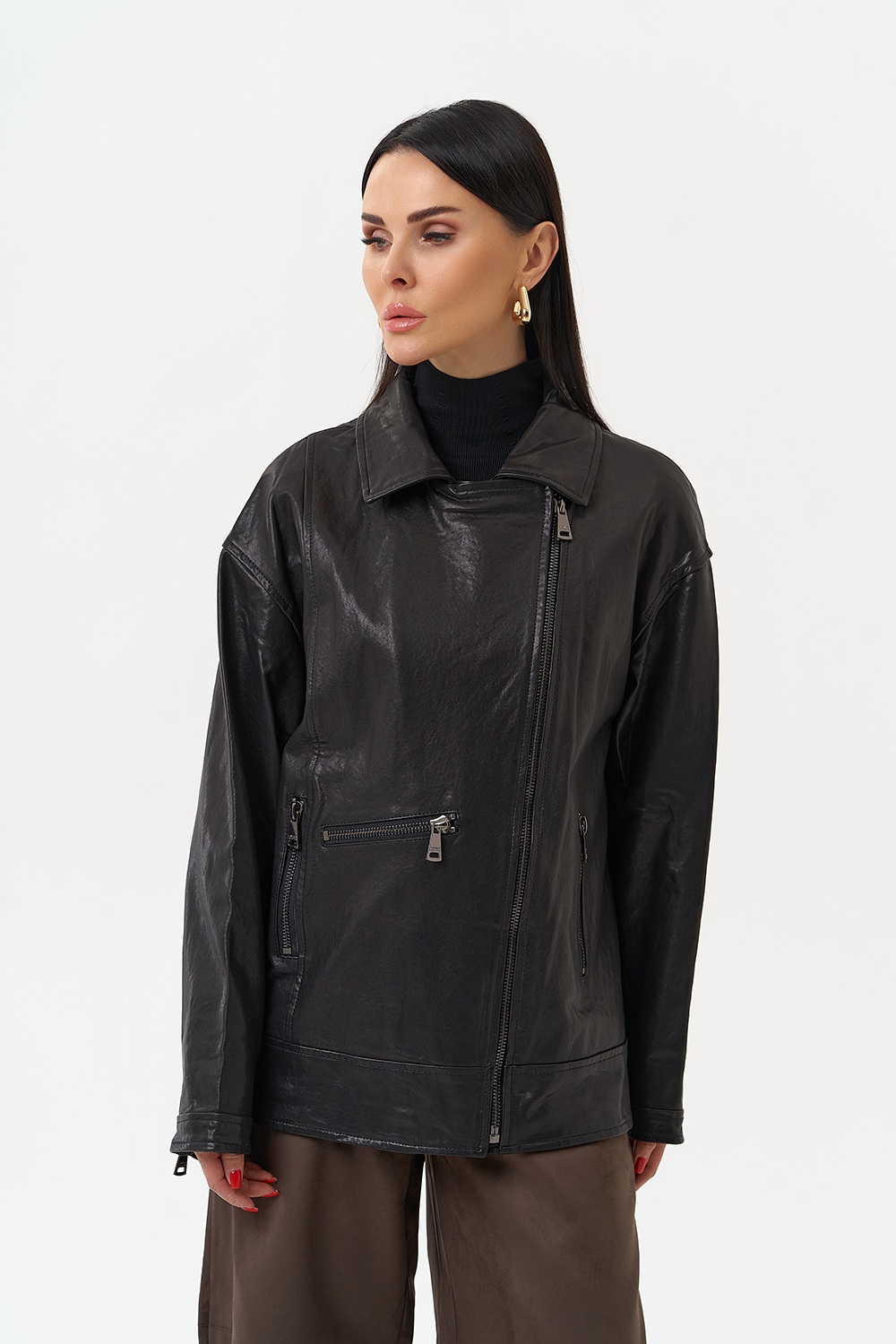 Женская косуха из натуральной кожи в черном цвете - универсальная модель, которая не сдает позиций с 1970-го года! В этом сезоне в трендовом оверсайз- фасоне. Он подойдет всем типам фигуры и будет хорошо смотреться с любым образом, а если вы хотите выделиться, то наденьте ее с легким платьем. Косуха дополнена отложным воротником и молнией. Если вы ищете куртку, которая будет вне времени и будет сочетается с любой одеждой, то это то, что вы искали.