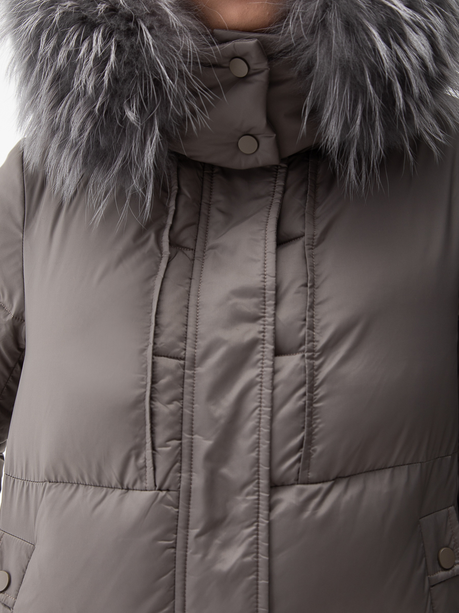 Крой воротника - съёмный капюшон, отделка енот