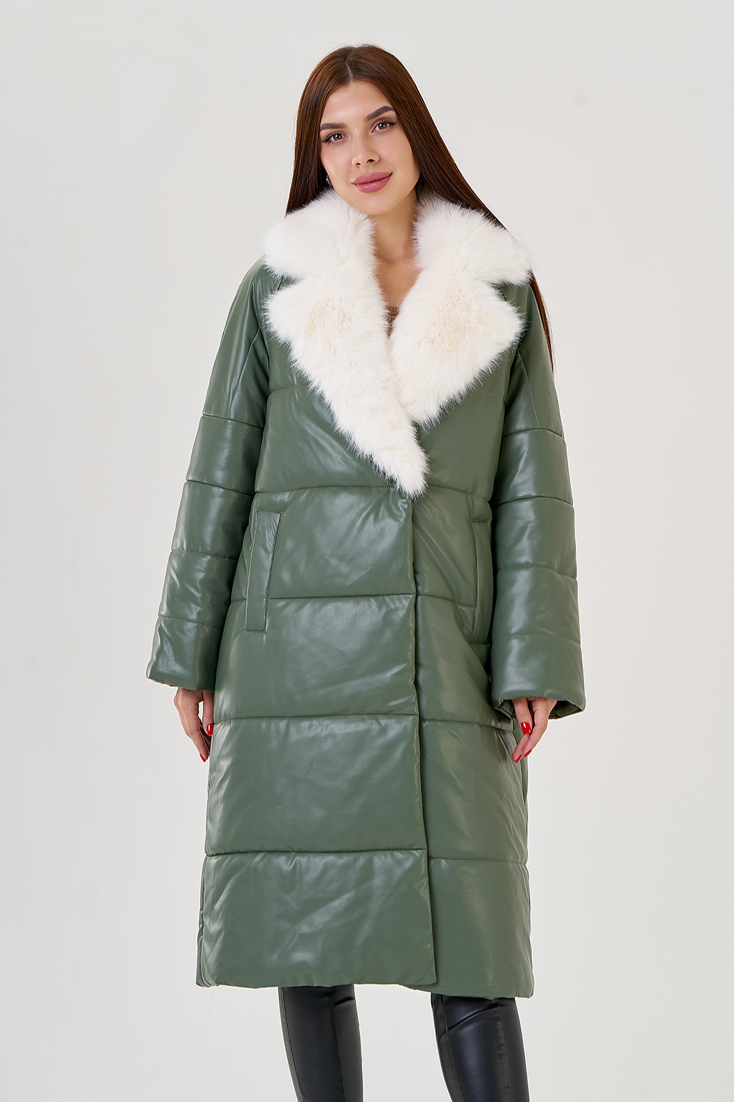 Пуховик в зеленом цвете с воротником из эко меха. Модель выполнена из эко кожи, что позволяет ей быть прочной и эластичной. Меховой воротник отстегивается. Английский ворот подчеркнет вашу шею. По бокам имеются прорезные карманы. В комплекте идет пояс из материала верха.
